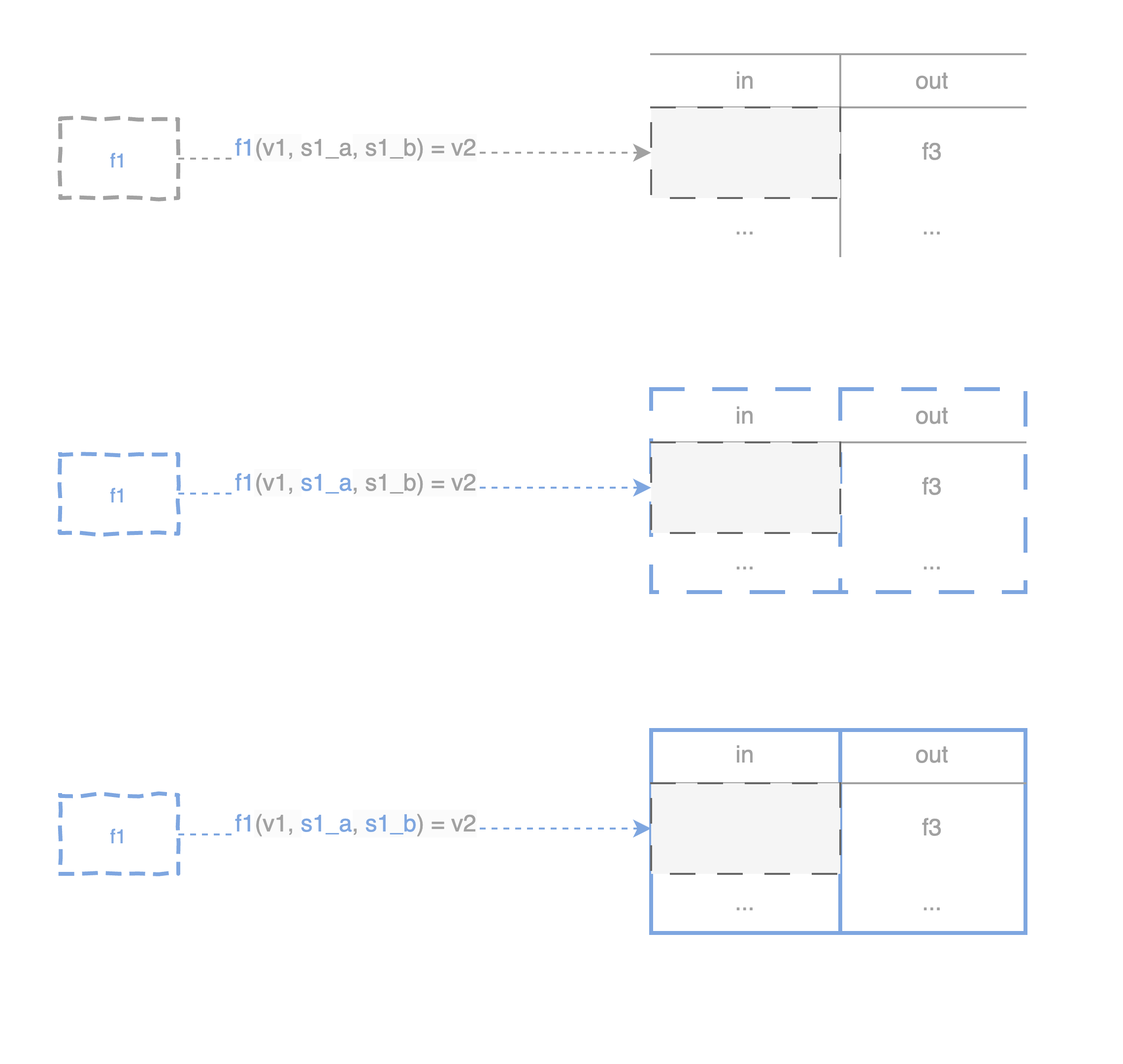 For example, without enforcing the immutability of the locking script arguments, the argument v2 can be assigned two different values across different locking scripts. This doesn't guarantee state transitions represented by the f1 and f2 locking scripts, as it can make up different values for v2 to just pass the execution of a locking script.