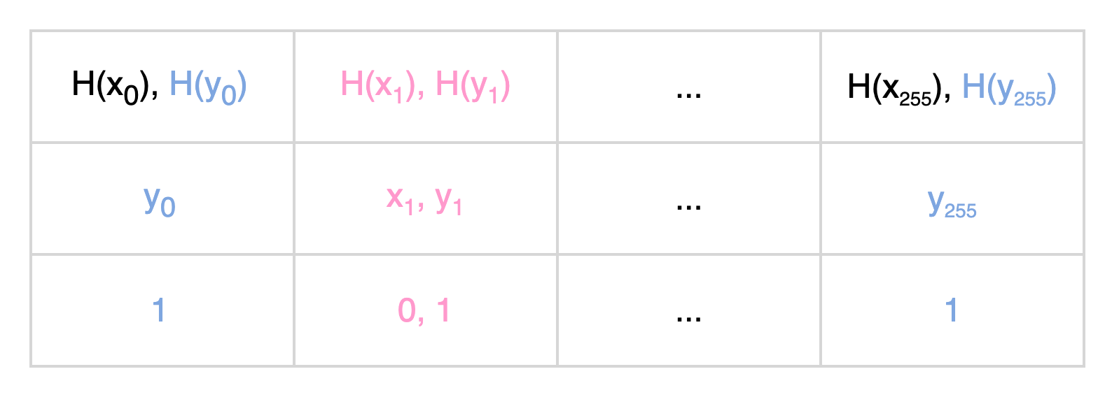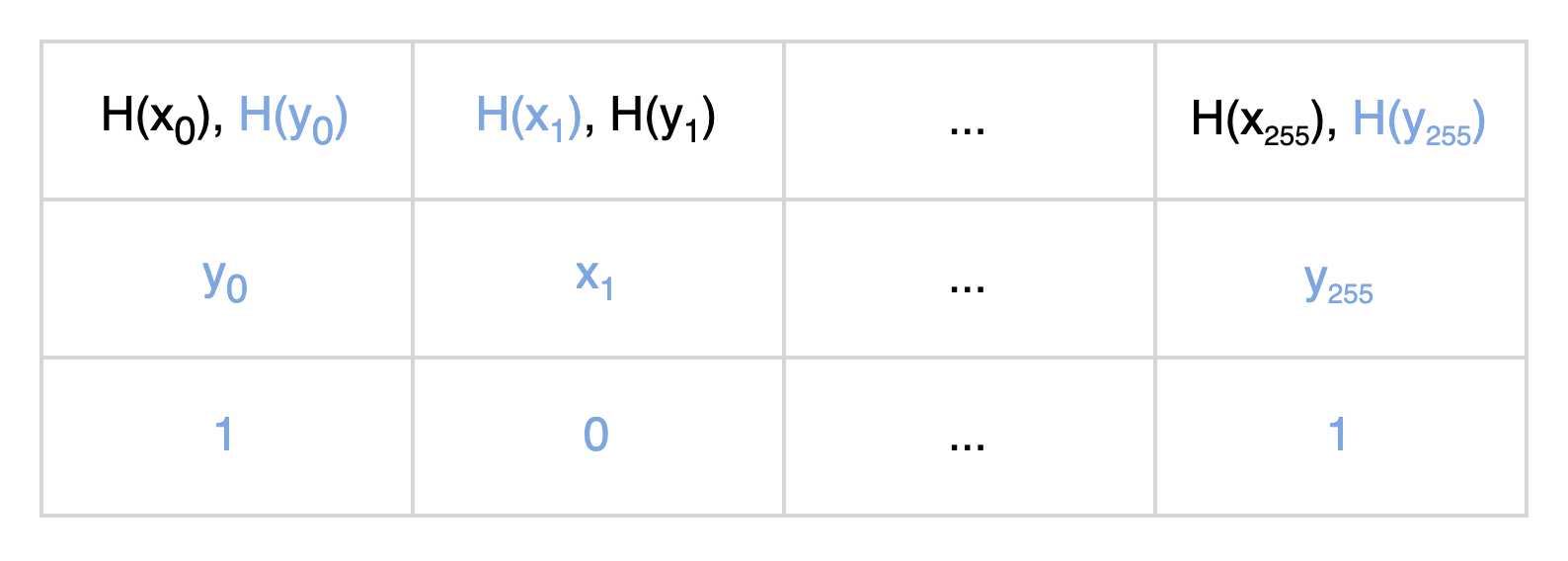 The table below illustrates the relationship between a Lamport signature's public key, private key and the 1-bit to sign.