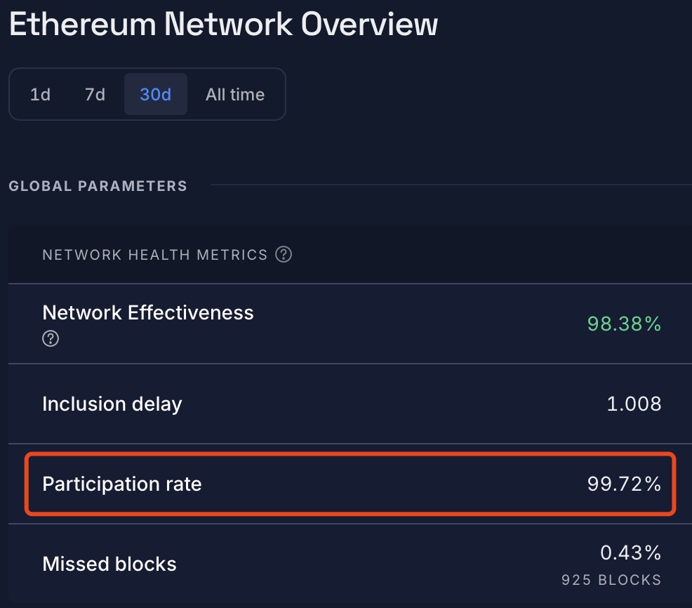 For example, both Ethereum and Solana have very high participation in practice (Ethereum participation ~99%+, Solana vote success rate ~99%+ on Rated), far better than the worst case assumption: